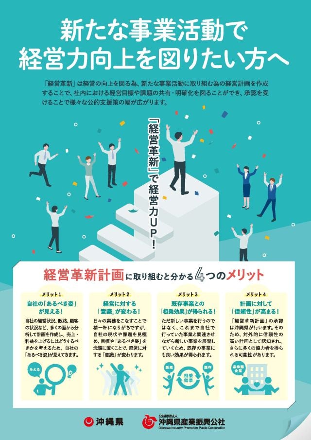 沖縄県の経営革新計画の承認を受けた企業を対象に、計画承認後の経営アドバイスやビジネスマッチング等のハンズオン支援を行うことで経営革新計画の着実な実行を支援します。